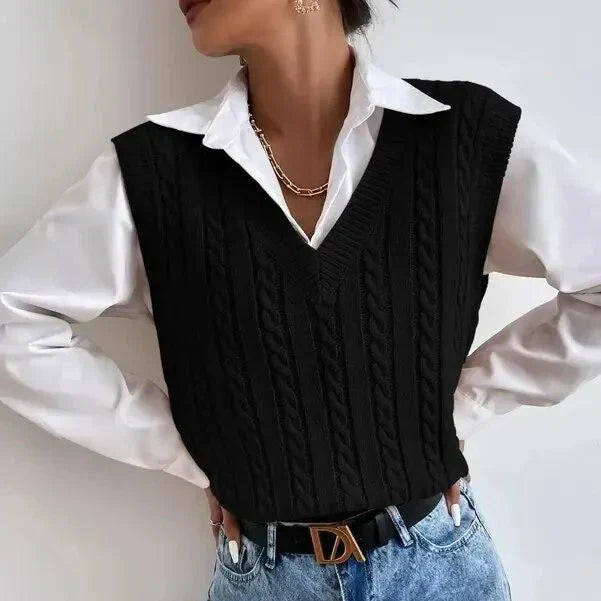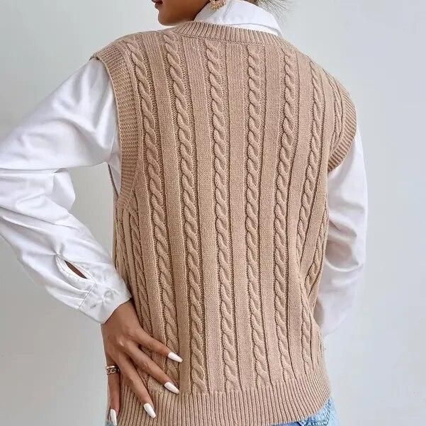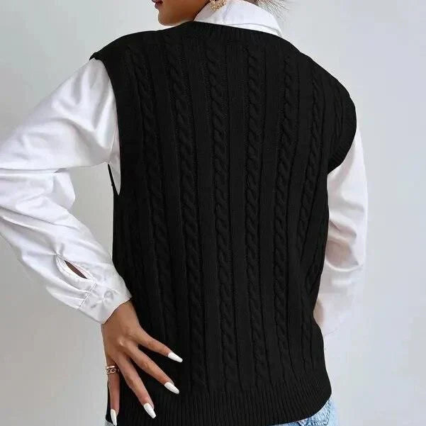 Enhance your winter wardrobe with our chic sleeveless knit cardigan. This stylish cardigan combines refinement and comfort, making it a must-have for fashion-conscious women. With its on-trend twist pattern and classic V-neck, this cardigan offers a versatile look, perfect for layering over a variety of outfits.