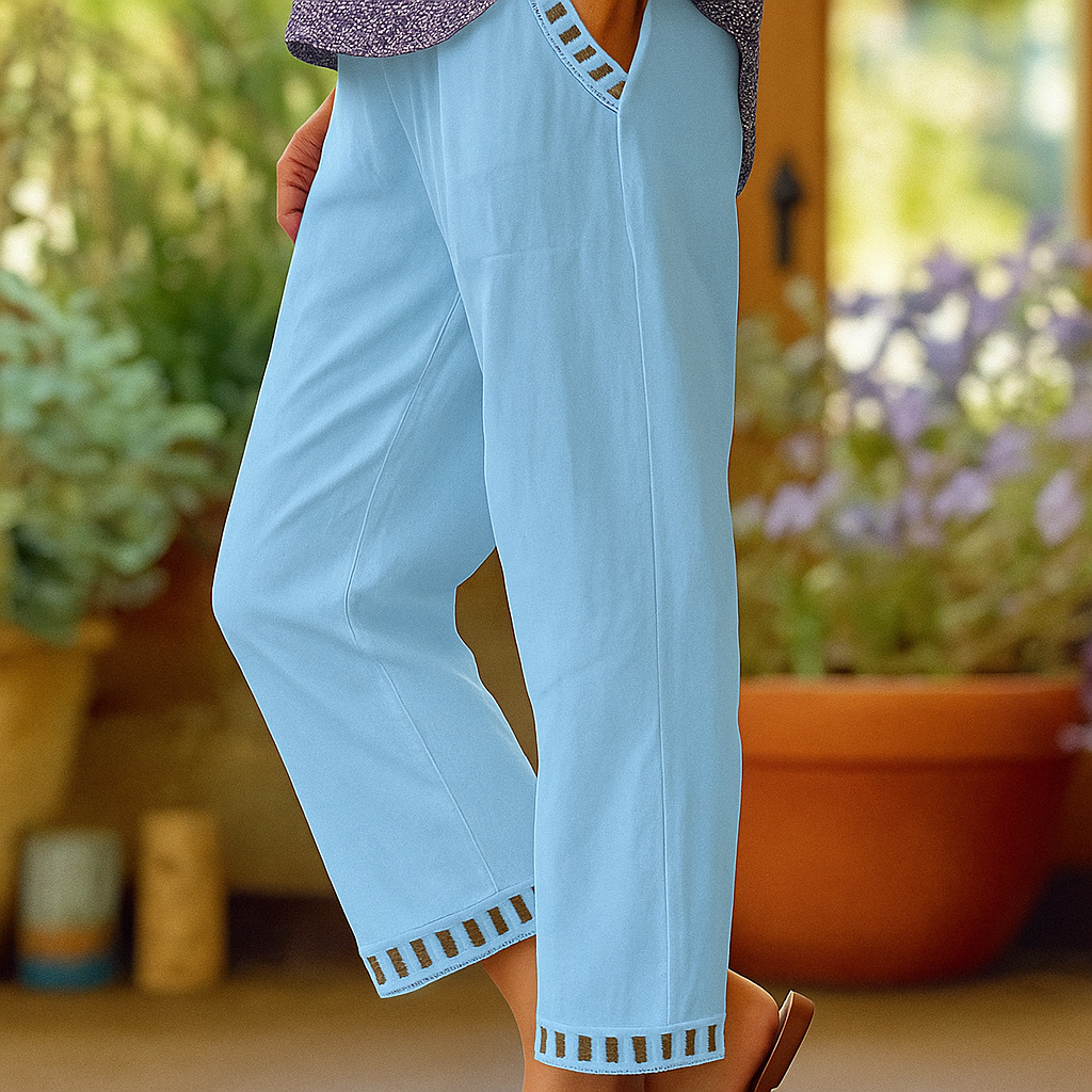 Thanks to the breathable fabric, you'll stay fresh – even when the temperature rises. The slim straight cut naturally accentuates your silhouette, while the elastic waistband conforms smoothly to your shape. The ankle-length length gives the trousers a playful look and makes them easy to pair with sandals, sneakers, or heels.