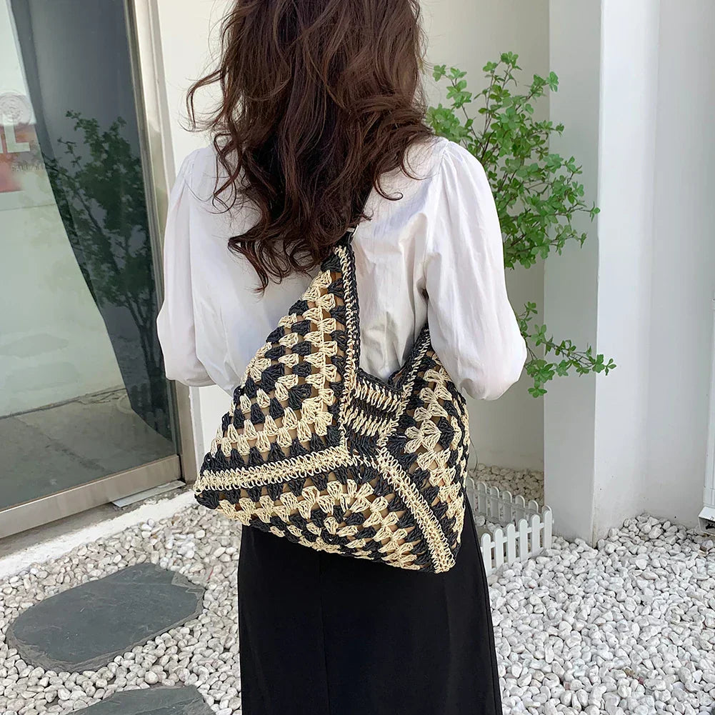 A bohemian handmade straw shoulder bag is a bag designed in a boho style, often with a rustic and natural look. These bags are often made from natural materials like wicker, seagrass, or rattan and are handcrafted by artisans. They combine aesthetics with functionality and are perfect for the summer months.